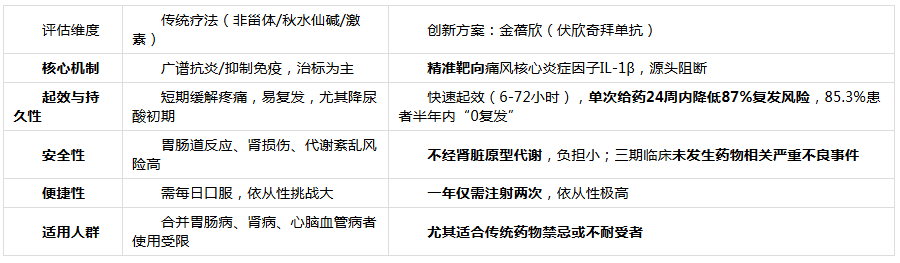 1、精准靶向:金蓓欣(伏欣奇拜单抗)是国内首个用于急性痛风的IL-1β全人源单抗,直接中和“炎症发动机”,而非简单止痛。